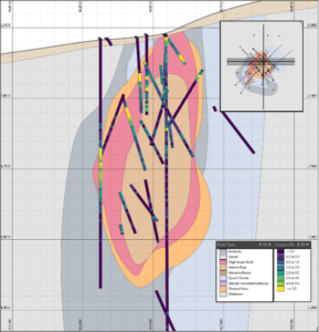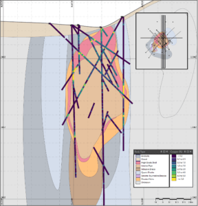 APEX personnel modeled all lithological units identified in the historical plan maps and sections and interpreted several mineralization domains (Figures 1 and 2). Based on the historical data reviewed, the highest-grade copper (“Cu”) domain is interpreted as a high-grade shell (the “High-Grade Shell”) located outside the interior pipe (the “Interior Pipe”), with an average grade of approximately 2.4% Cu. Surrounding that shell, APEX interpreted and modeled a sheeted vein (the “Sheeted Vein Zone”) domain with average grades of approximately 0.9% Cu. The Interior Pipe domain averages 0.60% Cu. APEX personnel also modeled two breccia types—intrusive breccia and sericite-tourmaline breccia—which returned similar average copper grades of approximately 0.3% Cu and may be grouped as a single breccia- style domain for future work. At a broader scale, andesite and quartz biotite form a lower-grade mineralized envelope averaging approximately 0.15% Cu and may likewise be grouped as a single low-grade domain. Additional low-grade mineralized shells were interpreted on the north side of the deposit, but APEX noted that these areas will require additional logging data, including relogging of historical core, and additional drilling to confirm continuity. The grades of these domains are based on length-weighted average %Cu and do not take into account gold or silver by-products at this stage of analysis.