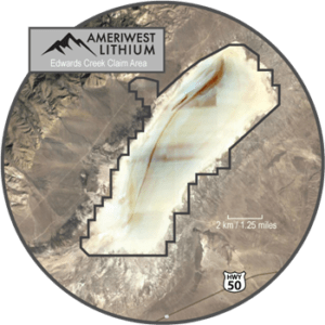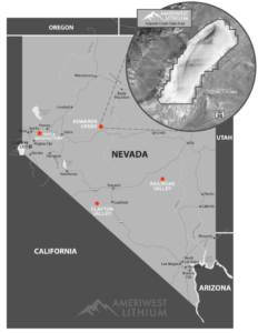 Ameriwest Lithium Inc. is a Canadian-based exploration company with a focus on identifying strategic lithium mineral resource projects for exploration and development. The Company is currently focused on exploring Nevada’s Deer Musk East property, located in the prolific Clayton Valley, totalling 5,600 acres, the Railroad Valley property, totalling 6,200 acres and Edwards Creek Valley totalling 16,940 acres. Additionally, Ameriwest’s current resource portfolio includes the ESN Project, located in White Pine County, Nevada, and the Koster Dam property, located in the Clinton Mining Division of British Columbia, in which Ameriwest has a 45% interest.