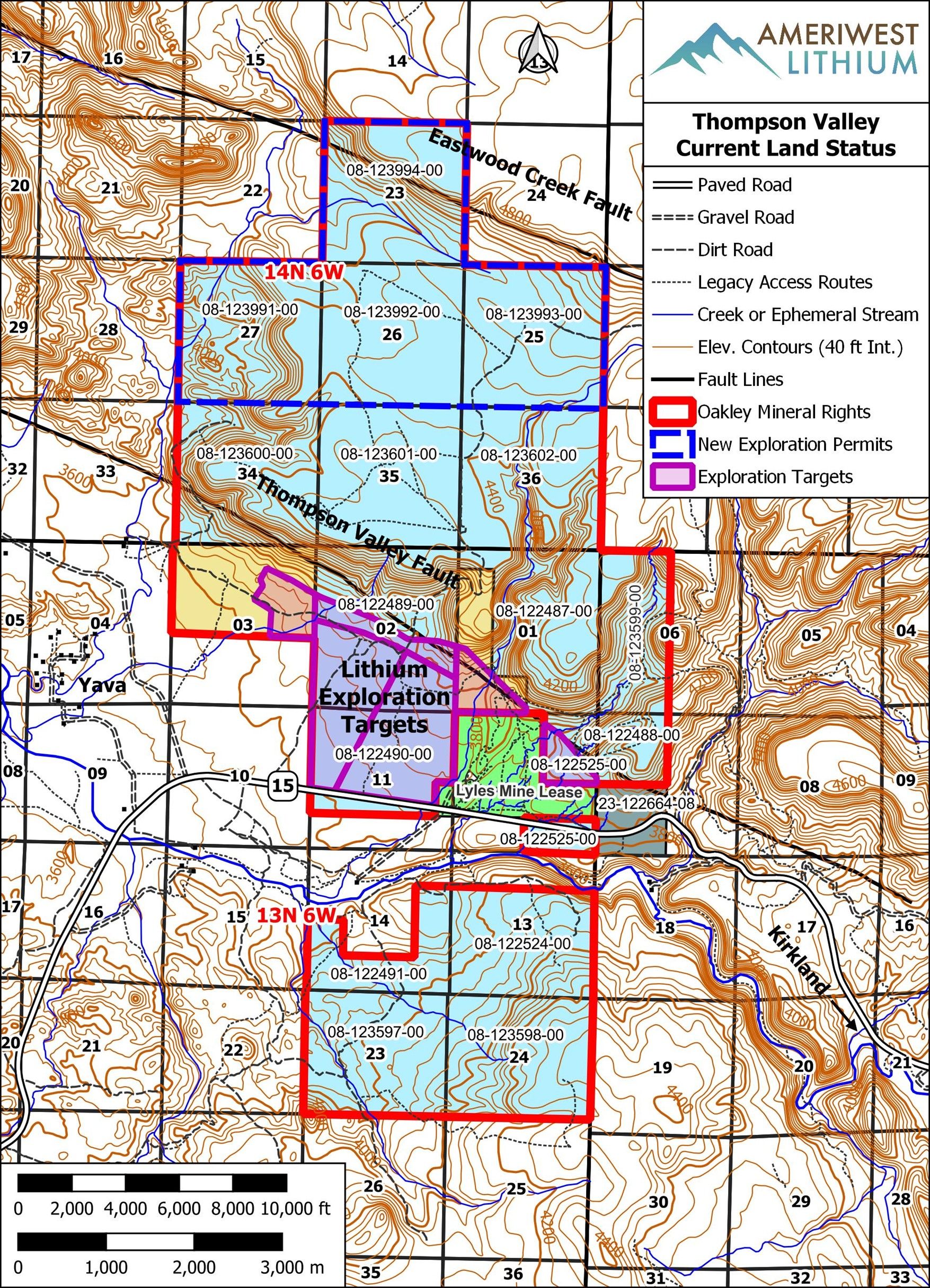 Ameriwest Lithium’s CEO, Mr. David Watkinson, commented “With the encouraging results announced by Ameriwest in December 2022 and with completion of the Technical Report in May 2023, our team has identified six exploration targets at Thompson Valley. We expanded the size of the project area to the north to perfect and protect our land position. Our current plans are to initiate our inaugural drill program in 2023 to test these targets, pending necessary permits, drill availability, and favorable weather conditions. We have mobilized a field crew to lay out drill pads and drill roads. We expect to complete archaeological and native plant surveys within the next few weeks, to be followed by submission of a Geological Field Plan of Operations (“GFOP”) to the ASLD.”