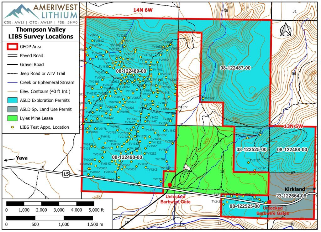 Vancouver, British Columbia, June 07, 2022 — Ameriwest Lithium Inc. (“Ameriwest” or the “Company”) (CSE: AWLI) (OTC: AWLIF) (FSE: 5HV0), a North American lithium exploration and development company, is pleased to announce it has received approval from the Arizona State Land Department to commence its Geological exploration plan on its Thompson Valley Property, Arizona, USA. During the week of June 13, 2022, Ameriwest’s Thompson Valley Property will commence extensive soil, and outcrop sampling carried out by its experienced geological team (figure 1). The acquired samples will be submitted to a qualified laboratory for assay.
