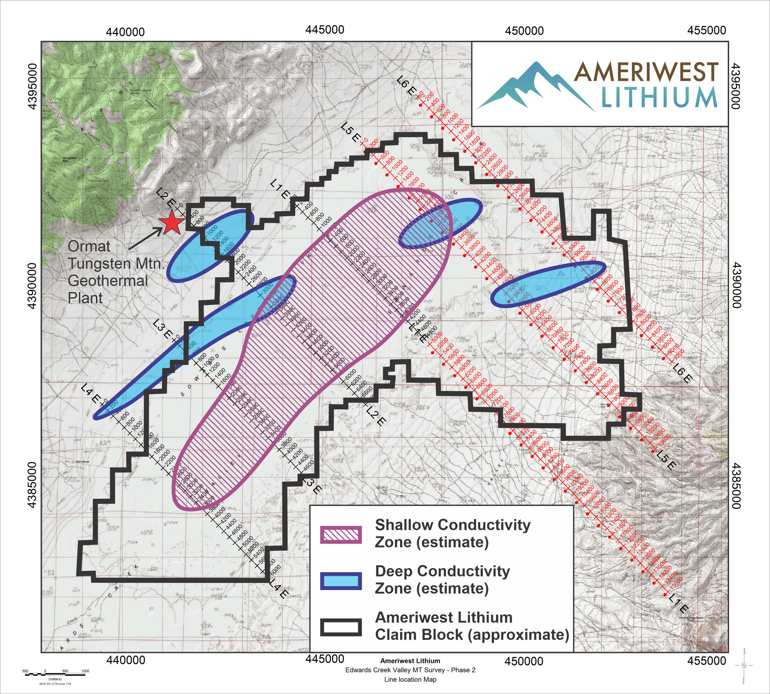 Vancouver, British Columbia, October 5, 2022, Ameriwest Lithium Inc. (“Ameriwest” or the “Company”) (CSE: AWLI) (OTC: AWLIF) (FSE: 5HV0), a North American lithium exploration and development company, is pleased to announce that results from a magnetotelluric (“MT”) geophysical survey (the “MT Survey”) at its Edwards Creek Valley Property, Nevada (“Edwards Creek” or the “Property”) shows potential for the Property, located about 120 miles east of Reno, to host a much larger shallow brine target than previously thought.