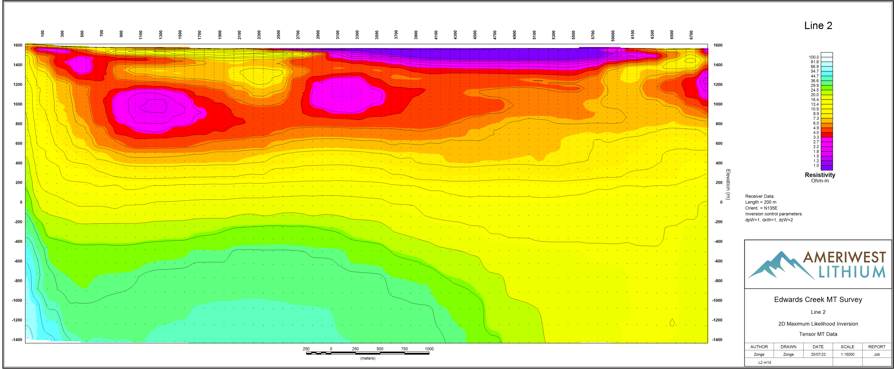 Figure 2 is a representative cross section showing MT measurements (resistivity) along MT Line 2 (Line 2’s location is shown in Figure 1). The cross section shows a large shallow near surface zone of high conductivity in the dark colors. Ameriwest is looking for areas with a resistivities of less than 1.5 ohm-m. Low resistivities of less than 1.5 ohm-m indicate the potential location of brine targets which may host lithium. Figure 2 also shows several deeper subsurface zones of low resistivity (high conductivity) that represent multiple deeper brine targets.
