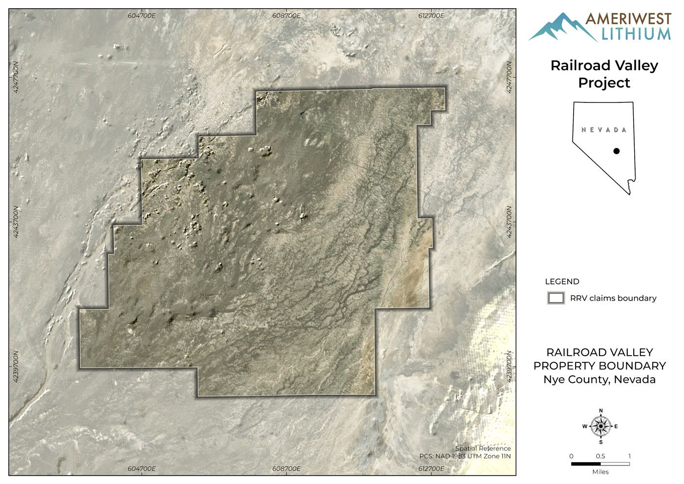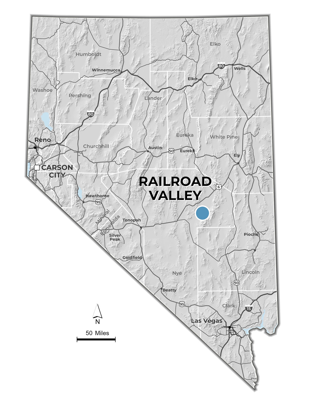 The 11,200-acre Railroad Valley Property (“RRV” or the “Property”) is a lithium brine exploration target located in Railroad Valley, Nevada. The North Railroad Valley drainage basin is larger in size and has similar geologic potential to host a lithium brine deposit similar to the one found in Clayton Valley, Nevada, located just 125 mi to the west-southwest. Clayton Valley currently hosts the only operating lithium brine operation in North America, the Silver Peak Mine, owned by Albemarle Corporation (NYSE: ALB).