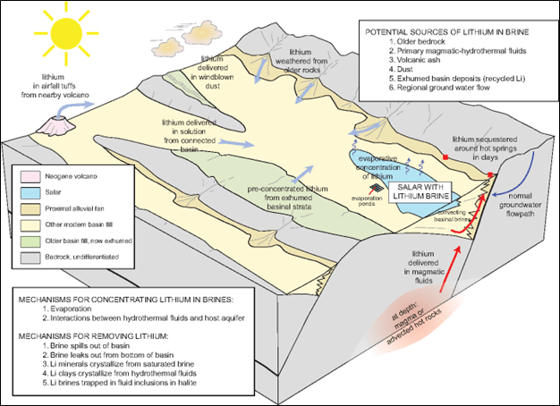 The figure above shows a closed basin that has been filled with sediments. Sources of lithium could be hot springs, magmatic fluids from below the valley, lithium weathered or eroded from adjacent mountains, and other possible sources. Typically a playa or salar is present and evaporation and precipitation of lithium in a brine solution over geologic time may build up lithium in aquifers at depth.